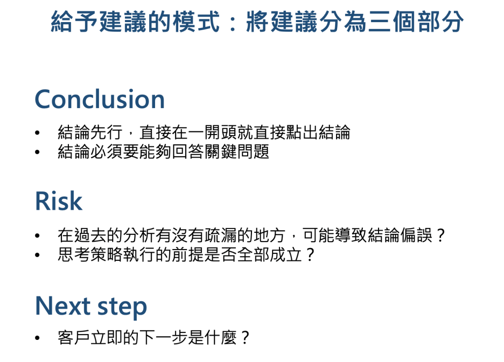 建立從不同面向分析 Case 的能力,包含 Brainstorming、Calculation 以及 Chart