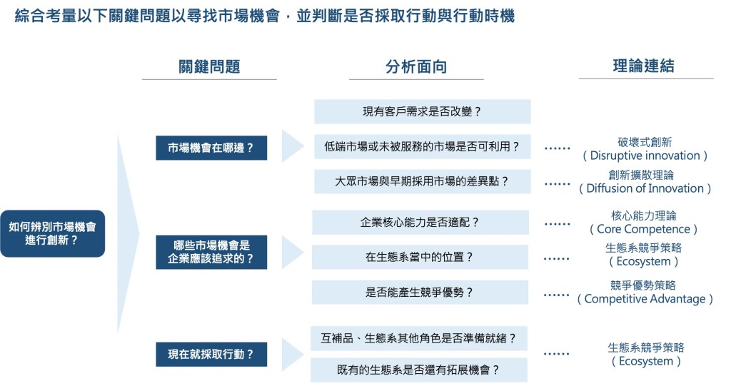 市場機會會被忽略,有時是因為它在前期並不明顯,又或著是企業不認為它有吸引力、認為會侵蝕現有業務而忽視,前述的柯達就是忽略了數位化時代的機會而被顛覆,企業要辨識新的市場機會,我認為可以從以下三個關鍵問題開始著手:市場機會在哪邊?哪些是企業應該追求的機會?現在就採取行動?