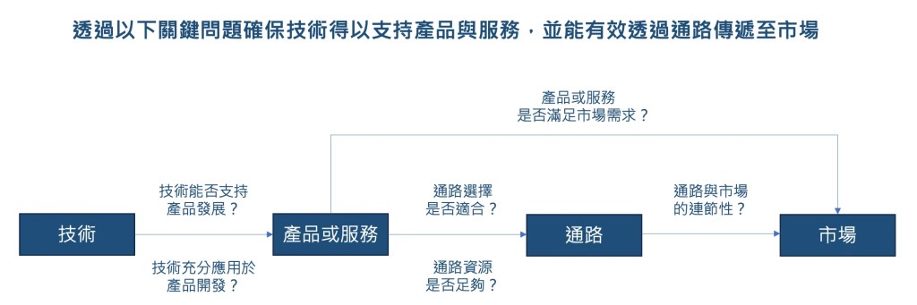 在本文的最一開始有提到,技術創新與市場價值之間的連結並不是「有了技術能力就能夠獲利」這樣的簡單,在有了技術之後,需要有承載技術的載體,也就是具體能解決消費者需求的產品與服務,而這些產品與服務需要有通路進行串接,這些要素都需要完整考慮,因此我認為較完整的思考架構應該包含「技術 → 產品或服務 → 通路 → 市場」。