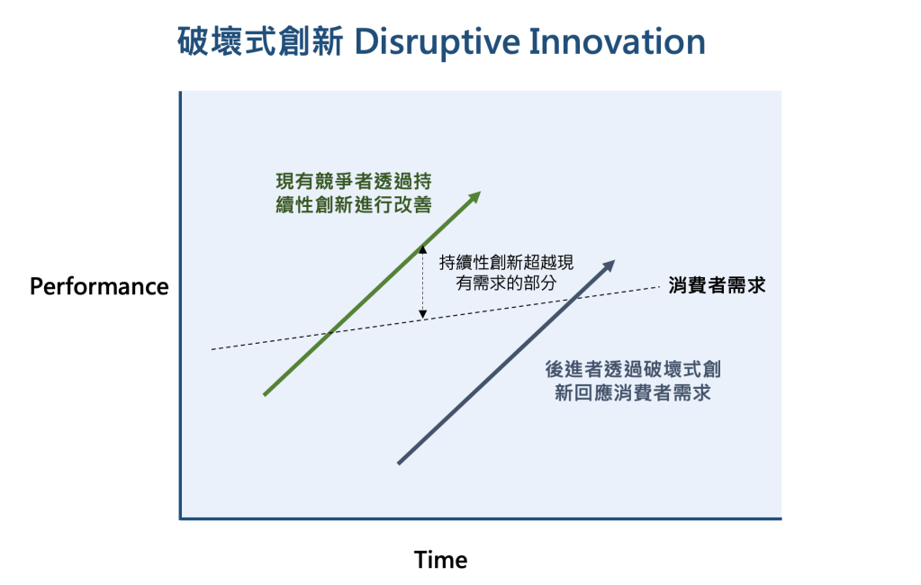 以低成本、較簡單的解決方案服務市場,再逐步完整化解決方案,最終將有機會顛覆主流市場