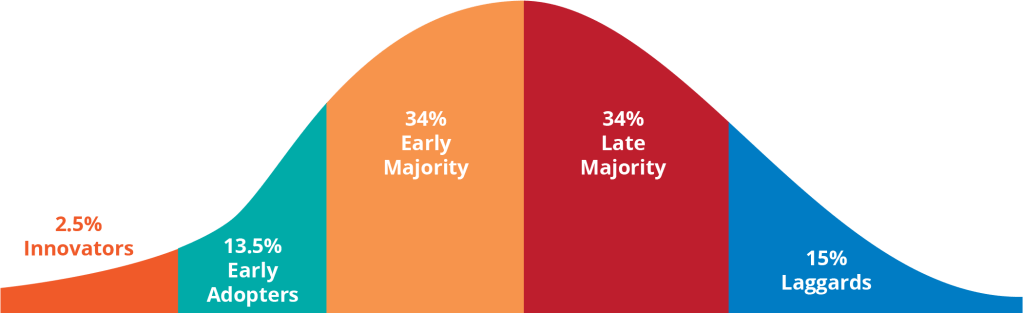 第三個「早期採用市場」,是借用創新擴散理論的概念,這個理論主要在分析創新產品在各時期所可能的銷售狀態,進而預測該產品在市場中為消費者所採用的情形。有許多創新的產品可能會被早期採用市場所採用,但始終無法跨越鴻溝推廣至大眾市場,例如智慧眼鏡、VR 頭盔就是例子,這時若能針對大眾市場無法接受的原因去進行改良,便有機會找到新的市場機會。